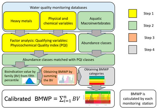 The calibration process ensures that the final result (bioindication values for macroinvertebrate families and BMWP water quality classes) is defined according to the environmental conditions of the streams studied. The modification of the calibration protocol by Ruiz-Picos et al. [26] included a set of seven heavy metal concentrations as qualifying variables.