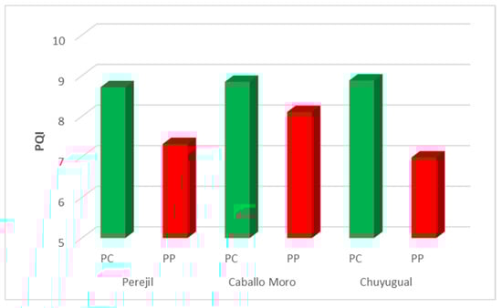 Regarding the mean PQI scores, the minimum score was 4.8 for station P39 in the Chuyugual zone, and the maximum was 8.95 for station P24 in the Caballo Moro zone (Figure 3).
