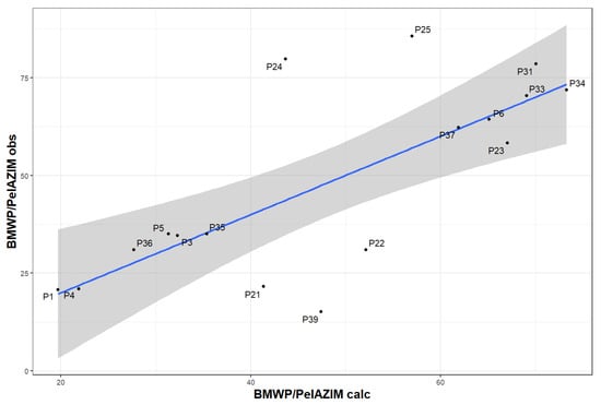 Figure 5 shows the regression model for calculated and observed BMWP/PeIAZIM values. Five sites fell outside the 95% confidence interval.