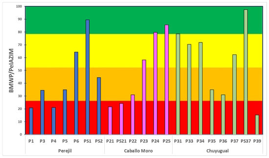 The monitoring stations classified as Fair quality were PC (without mining influence): PS1 in the Perejil zone, P24 and P25 in the Caballo Moro zone, and PS37 in the Chuyugual zone. Station P31, although not influenced by mining, obtained a mean BMWP/PeIAZIM value of 79, placing it in the Poor quality category. Its conservation status should be monitored before its deterioration worsens.