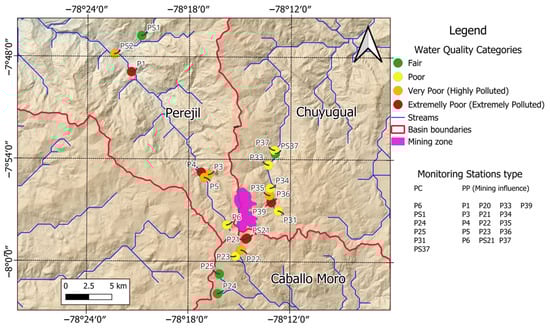 Figure 7 shows the spatial representation of mean BMWP/PeIAZIM values for the entire study period based on the BMWP traffic-light signage. This figure shows that the monitoring stations near the mining area belong to the lowest water quality categories (mainly in the Chuyugual zone). According to the BMWP/PeIAZIM, water quality improves downstream.