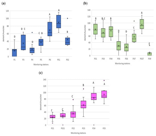 Tukey’s (HSD) and Duncan’s post hoc tests were used to assess the statistical significance of differences in BMWP/PeIAZIM index values between monitoring stations. According to these tests, stations PS1 and P6, considered reference stations (PC), had the highest mean BMWP/PeIAZIM scores (89.5 and 69.07, respectively; Group A), showing significant differences compared to the other stations in this zone. PS2, P3, and P5 were of intermediate quality (Groups B, C, and D), and P1 and P4 belonged to the lowest quality (Group D) (Figure 8a). The most frequent families in stations P1 and P4 were Elmidae, Baetidae, and Chironomidae, with the lowest bioindication values (5, 6, and 6, respectively; Table 1).