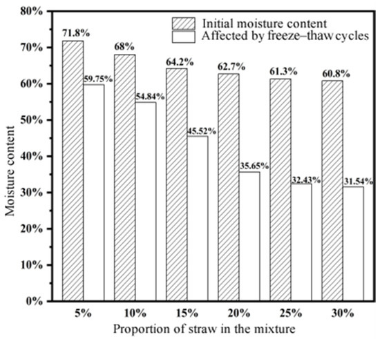- With a gradual increase in the amount of added straw, notable reductions were observed in both the solidification reactivity factor (SRF) and the cake moisture content. Upon reaching the optimal straw mixing ratio of 20%, the SRF minimized to 1.301012 m/kg. Subsequent increments in straw addition yielded marginal improvements in dewatering performance.