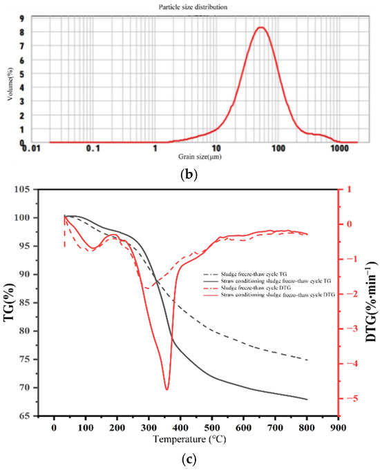 - Incorporating straw conditioner facilitated the formation of supplementary channels in the dewatering process, while the synergistic impact of freezing–thawing cycles contributed to a decreased particle size of the sludge, consequently elevating its dewatering efficiency. Thermogravimetric analysis highlighted that the freezing–thawing cycles of straw-conditioned sludge escalated the maximum weight loss rate during volatilization and combustion phases. Additionally, straw conditioning elevated the temperature associated with substantial weight loss in the sludge during thermal decomposition.