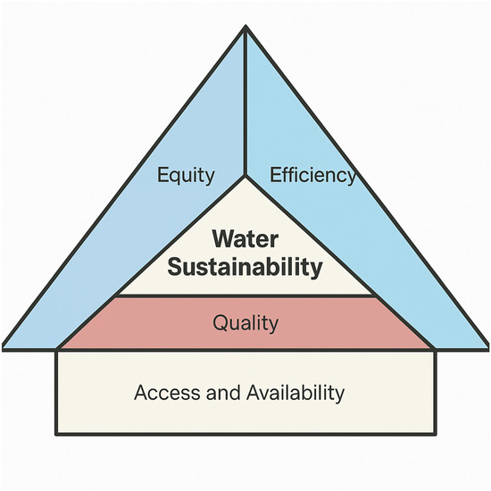 The integrated dimensions of freshwater sustainability describe how effectively and efficiently water resources perform their multiple functions and support various needs, whether for human consumption, agricultural use, industrial processes, or ecological balance [53] (Figure 2). They encompass how well water resources are managed, distributed, and utilized to meet the needs of populations, ecosystems, and economies. Nigeria’s water sector struggles with inefficiencies due to weak institutional capacity, inadequate funding, and fragmented policies that fail to address growing water demands. Governance challenges result in overlapping responsibilities between federal, state, and local authorities, leading to poor coordination and ineffective implementation of water policies. The inefficiencies in Nigeria’s water sector significantly impact the efficacy of water management, limiting access to clean and reliable water for millions of people. This disjointed approach hampers integrated water resource management (IWRM), reducing efficiency in water allocation, conservation, and disaster preparedness, particularly during droughts and floods, making it difficult to provide equitable and sustainable access to clean water. Key aspects of water sustainability include the following (Figure 2):