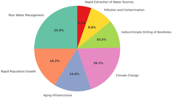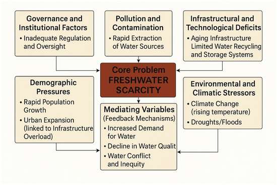 Freshwater scarcity is a complex and multidimensional challenge influenced by a range of interrelated drivers (Figure 3). At its core, it stems from failures in governance and institutional frameworks, where poor water management, indiscriminate drilling of boreholes, and inadequate regulatory oversight prevent the sustainable use and distribution of water resources. This institutional weakness is compounded by infrastructural and technological deficits, particularly aging infrastructure and the limited development of water recycling and storage systems, which reduce the system’s ability to respond to growing demand and environmental variability.