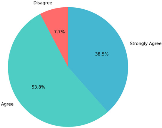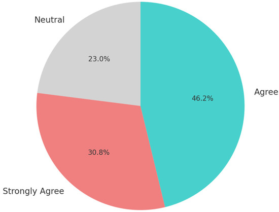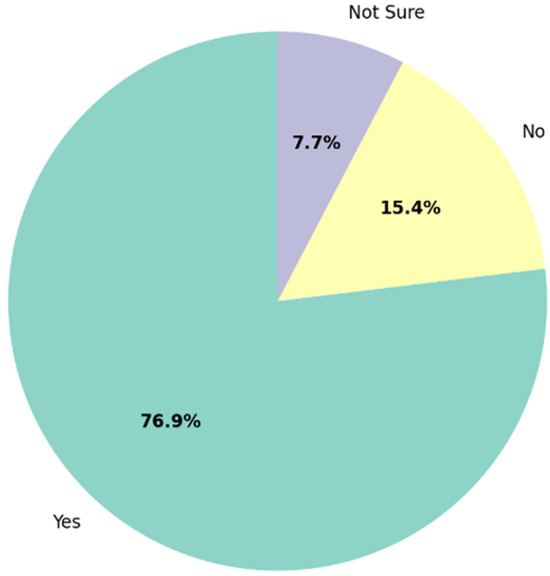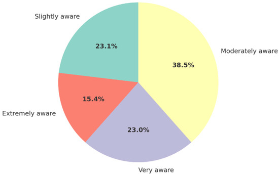 Awareness of the impacts of climate change on freshwater resources is moderate to high among respondents. The data shows that 38.5% are moderately aware, 23.1% are very aware, and 15.4% are extremely aware, while only 23.1% are slightly aware and none are completely unaware, indicating a relatively informed sample (Figure 5). This level of awareness could facilitate public support for water conservation policies and adaptive measures, though targeted education for the less-aware minority (23.1%) may further enhance community resilience.