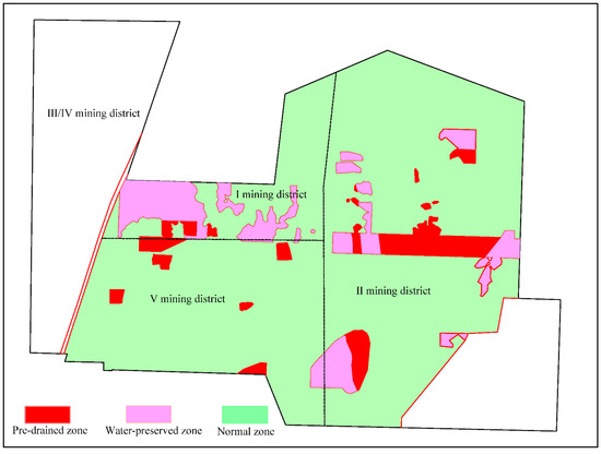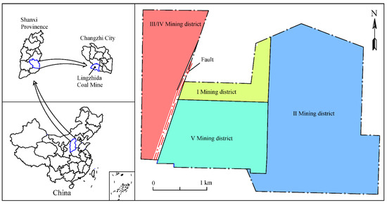 The main coal seams in Lingzhida Coal Mine are 3# and 15#, with the 3# seam having a thickness of 0–5.5 m and an average of 3.1 m, which is the upper coal seam studied in this work. The 15# seam has a thickness of 0.7–7.2 m with an average of 4.0 m, and is currently being mined [23]. The mine is divided into east and west parts by the Zhuangtou fault, with the I, II, and V mining districts being the main mining areas, as shown in Figure 1.