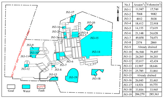 According to preliminary exploration, there are currently 19 goaf water areas in the 3# coal seam, with an estimated area of about 64 × 104 m2, as depicted in Figure 2 [23].
