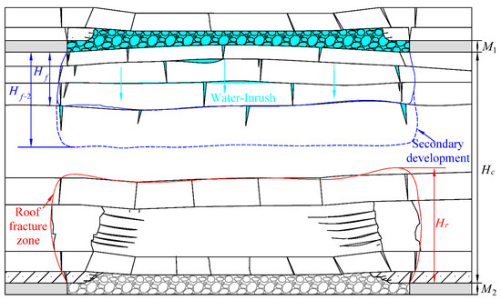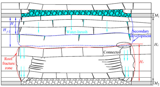 Here, the sum of the initial depth of the floor fracture zone and the roof fracture zone is less than the thickness of the interlayer strata. However, mining the lower coal seam induces secondary fracture development in the floor of the upper coal seam, increasing the depth of the floor fracture zone. As a result, the combined depth of the secondary developed floor fracture zone and the roof fracture zone becomes greater than or equal to the thickness of the interlayer strata (Figure 5). This situation also leads to water from the upper coal seam goaf flowing into the lower seam.