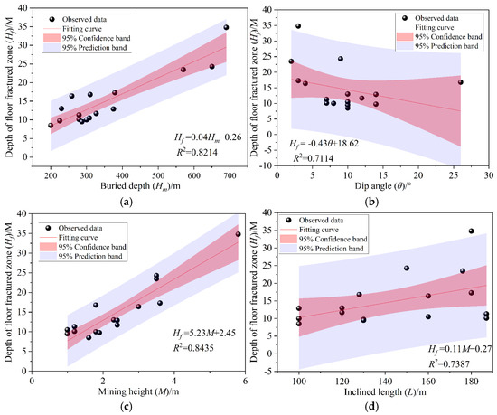 Figure 7 indicates there was a high degree of fitting between the buried depth, mining height, dip angle, inclined length, and the depth of the floor fracture. The specific results of various parameter indicators in the linear regression equation are shown in Table 2. Considering the depth of the floor fracture after mining, the linear regression equation is: