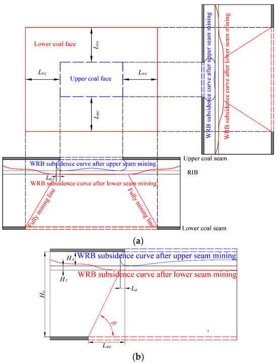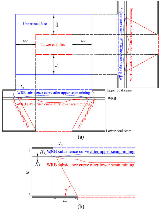 Here, Hw represents the residual intact strata (WRB) after the upper and lower seam mining, m; Hc represents the thickness of the interlayer strata between the upper and lower coal seams, m; Hf represents the depth of the floor fracture after the upper seam mining, m; and Hr represents the height of the roof fracture after the lower seam mining, m.