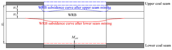 Whether the roof fracture of the 15# seam mining would connect to the overlying 3# goaf mainly depends on the thickness of the WRB between the upper and lower coal seams after mining. A simplified model of the interlayer strata is shown in Figure 10.