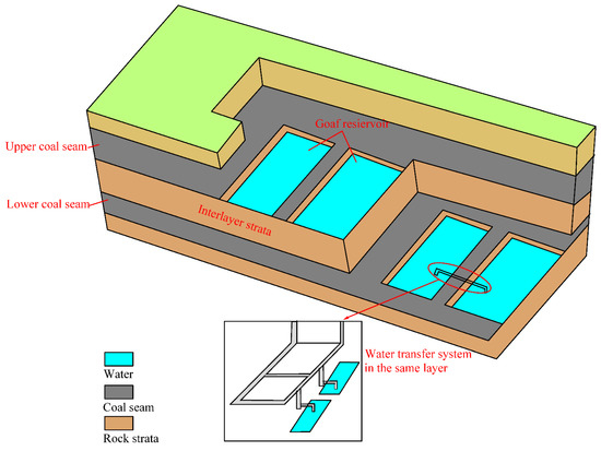 To address the mine water issues caused by the mining of the 15# seam, a thorough and accurate investigation of the surrounding water resource distribution should be conducted, followed by the development of a reasonable mining plan based on local conditions. The existing drainage system should be renovated, applying the principle of “connectors.” Utilizing geographical features, such as terrain differences, accumulated water in the goaf can be directed to underground reservoirs in low-lying areas with less accumulated water. This process should be facilitated through manual intervention and the installation of specific drainage pipelines. A three-dimensional schematic diagram of water regulation in the same-level underground reservoir is shown in Figure 19.