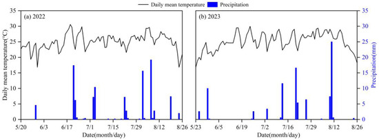 Daily mean temperature and precipitation during the processing tomatoes’ growth period in 2022–2023.