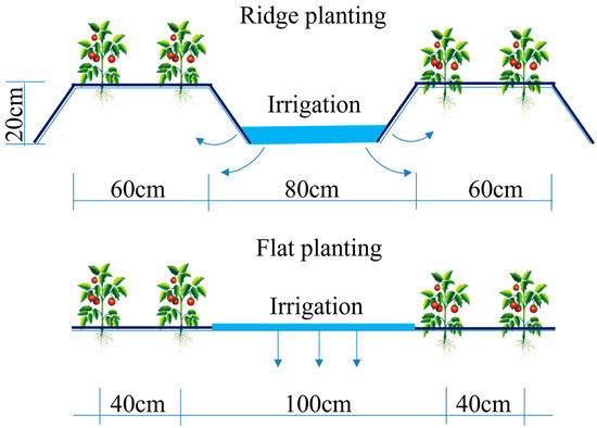 The experiment was conducted in both 2022 and 2023. A split-plot arrangement of treatments was used in a randomized complete block design with three replications. Each plot was 10 m long and 5 m wide, with an area of 50 m2. A wide–narrow row pattern was adopted with a width of 100 cm for wide rows and 40 cm for narrow rows, and black plastic mulch was applied on the narrow rows to maintain soil moisture and temperature. The tomato seedlings at the 3–4 true leaves stage were transplanted along the mulched narrow row with a row spacing of 40 cm and interplant spacing of 50 cm, resulting in a planting density of 36,000 plants per hectare. A widely planted local cultivar of “Tunhe No.5” was employed in the experiment. Two tillage methods were considered: ridge planting (with raised beds of 60 width and 20 cm height before mulch covering and plant transplanting) and flat planting, as shown in Figure 2. Three irrigation levels were included: full irrigation (100% I), mild water deficit (80% I), and moderate water deficit (60% I). Irrigation was triggered when the average soil moisture in crop root zone of the full irrigation treatment in flat planting decreased to 70 ± 2% of field capacity. The irrigation amounts of full irrigation treatments were calculated as the following: