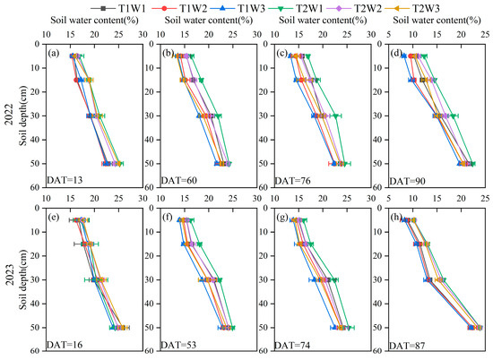 Dynamics of soil water content at different days after transplanting (DAT) in 2022 (a–d) and 2023 (e–h).