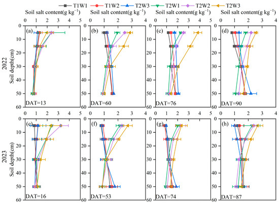 Dynamics of soil salt content at different days after transplanting (DAT) in 2022 (a–d) and 2023 (e–h).