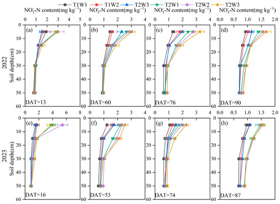 Dynamics of soil nitrate nitrogen content at different days after transplanting (DAT) in 2022 (a–d) and 2023 (e–h).