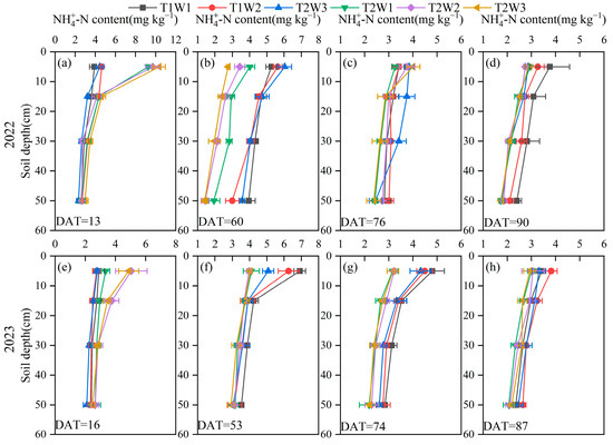 Dynamics of soil ammonium nitrogen content at different days after transplanting (DAT) in 2022 (a–d) and 2023 (e–h).