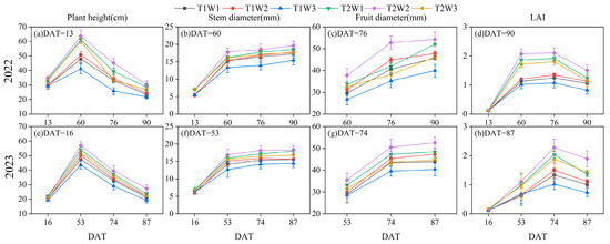 Dynamic changes in growth indexes of processing tomatoes at different days after transplanting (DAT) in 2022 (a–d) and 2023 (e–h).