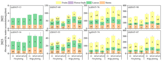 Dry matter accumulation and organ distribution in aboveground parts of processing tomatoes at different days after transplanting (DAT) in 2022 (a–d) and 2023 (e–h). Different lower-case letters in the same color bar indicate significant differences among treatments (p < 0.05).