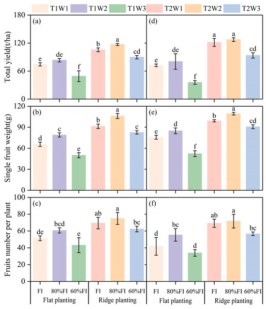 Effects of different irrigation and tillage practices on total yield, single fruit weight, and fruits number per plant in 2022 (a–c) and 2023 (d–f). Different lower-case letters in the same color bar indicate significant differences among treatments (p < 0.05).