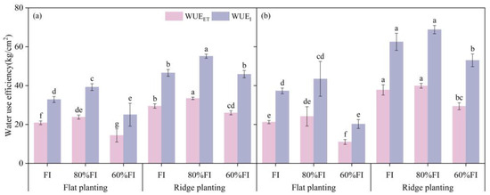 Effects of different irrigation and tillage practices on WUE of processing tomatoes in 2022 (a) and 2023 (b). Different lower-case letters in the same color bar indicate significant differences among treatments (p < 0.05).