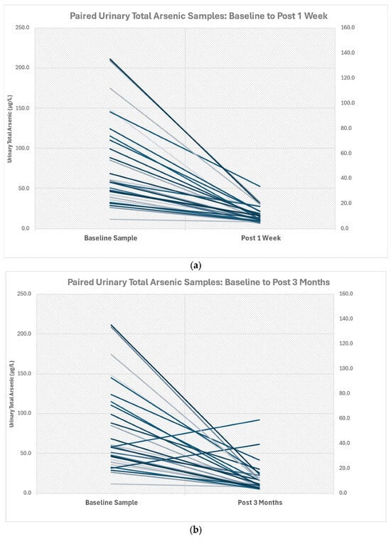 In addition to examining the overall trends by study period, we examined the changes in total urinary arsenic for each study participant. Figure 1a,b represent the total urinary arsenic concentration at baseline and one week and three months after arsenic removal technology was installed, for each participant. Apart from two participants (as illustrated in Figure 1b), all participants showed a reduction in total arsenic in their urine. A larger number of participants were observed to have an increased total urinary arsenic concentration from the post 1 week to post 3-month sampling periods. These increases could be associated with many factors, including drinking untreated water.