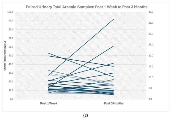 Total As in urine specimens for each study participant comparing the three data collection times: baseline, 1 week and 3 months post arsenic removal implementation and stabilization. (a): Comparing total urinary arsenic from baseline to post 1 week after arsenic removal implementation and stabilization. N = 29 participants who completed baseline and post 1-week study activities. (b): Comparing total urinary arsenic from baseline to post 3 months after arsenic removal implementation and stabilization. N = 25 study participants who complected study activities at baseline and post 3 months. (c): Comparing total urinary arsenic from post 1 week to post 3 months after arsenic removal implementation and stabilization. N = 25 study participants who complected study activities at baseline and post 3 months.