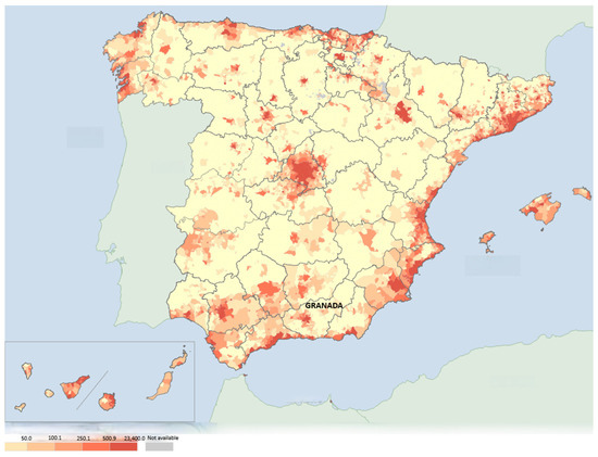 Population density in Spain, 2024. (Atlas Digital de las Áreas Urbanas del Ministerio de Vivienda y Agenda Urbana. Accessed on 5 June 2025: https://atlasau.mitma.gob.es/#c=indicator&i=pobevo.densidad&s=2024&view=map4).