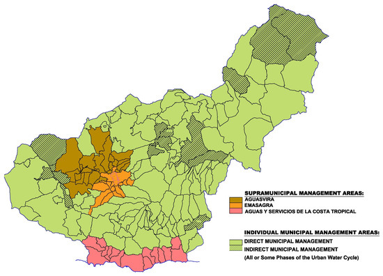 Population size is a determining factor in service management [22,23]. To take advantage of economies of scale in the industry, some municipalities have opted for municipal grouping [24,25]. In the province of Granada, up to three large supra-municipal management areas can be distinguished (Figure 2). In the Vega de Granada, two municipal groupings have been created for urban water cycle management: the Granada metropolitan area, made up of 15 municipalities and just over 390,000 inhabitants, and the Aguas de la Vega Sierra Elvira consortium, which includes 22 municipalities and provides services to 159,816 inhabitants. In both cases, the management of urban water cycle services has been delegated to a joint venture in which the private partner is a company from the multinational Veolia group. Additionally, on the Costa Tropical, a service area has been created comprising 16 municipalities and 115,000 inhabitants. In this case, the concession was awarded to a joint venture involving the multinationals Aqualia and Acciona.