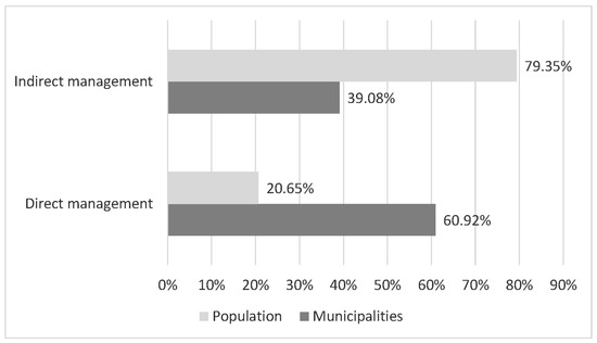 Finally, there are 106 municipalities where management is carried out directly (Figure 3); this represents almost two-thirds of the municipalities (60.92%) and one-fifth of the population (20.65%).