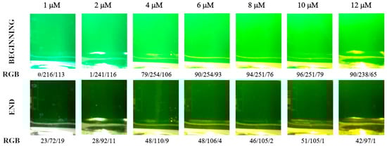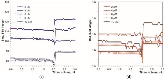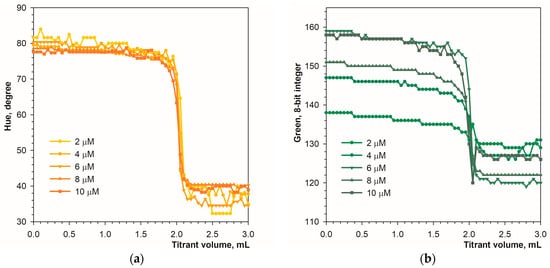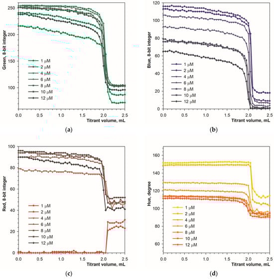 At the end point of the titration, the green signal drops rapidly by 130 units (Figure 7a). The concentration of the calcein indicator has little effect, especially above 6 μM. The blue signal drops by 60 to 100 units (Figure 7b). The red and Hue signals have smaller ranges of change (Figure 7c,d). It can be concluded that in fluorescence mode the calcein indicator is applicable in the concentration range from 1 to 12 μmol L−1.