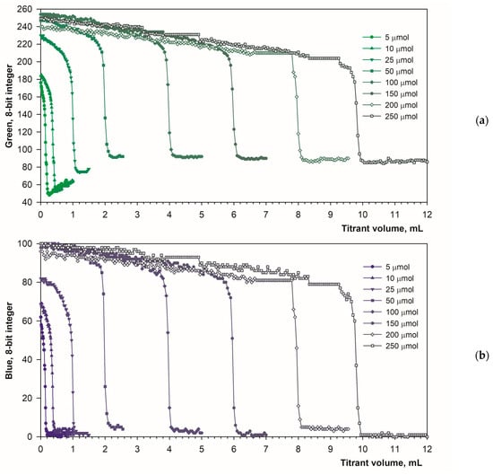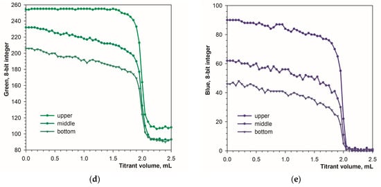 Digital cameras and scanners are already used in analytical chemistry, mainly for the direct measurement of transmittance and reflectance [,,,,,,,]. Several scientific reports have addressed the use of digital cameras for endpoint detection in titration techniques [,,,,,,]. Different color models are used to detect the color transition [,,]. The Red–Green–Blue color model is most commonly used. The Hue–Saturation–Intensity and Hue–Saturation–Value models may provide less fluctuation in the titration line due to the separation of color and luminance information []. The Hue parameter provides smooth titration graphs using an open mixing chamber without rigorous lighting control []. The Hue parameter and the inner product of RGB vectors have been compared using the same set of digital images []. Both parameters proved to be excellent in detecting endpoints.