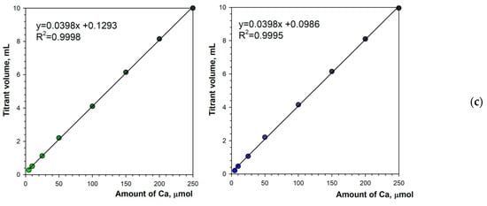 The selected optimal parameters allow for a reliable determination of the calcium content in the solution. Figure 8a,b show titration graphs obtained for calcium amounts ranging from 5 to 250 μmol. In fluorescence mode, the emitted light does not depend on ambient lighting due to stable luminous flux from the spotlight used (Figure 1b). Additionally, the black background minimizes the reflectance of diffused ambient light. As a result, the titration graphs have uniform character throughout the measurement series (Figure 8a,b). As the calcium concentration increases, the endpoint drop in the green signal decreases only slightly (Figure 8a). Therefore, the upper range of determination is probably far higher than the tested value of 250 μmol. Figure 8c shows the excellent linearity of the method. The coefficients of determination are R2 = 0.9998 and R2 = 0.9995 for the green and blue color components, respectively. Both the linear equations have the same slope of 0.0398 mL μmol−1. The graph shift values are irrelevant (0.1293 mL and 0. 0986 mL for the green and blue color components, respectively).