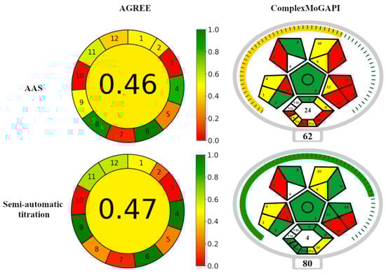 In terms of environmental friendliness, the semi-automatic titration procedure and the AAS method have their own advantages and disadvantages. According to the AGREE test, semi-automatic titration requires the use of larger analyte portions and is less efficient (criteria 2 and 8 in Table 6 and Figure 9) compared to the AAS method. On the other hand, the semi-automatic titration is a more economical method than AAS in terms of the organization of the analytical procedure and energy consumption (criteria 4 and 9 in Table 6 and Figure 9). Moreover, titration is preferred due to the lower consumption of toxic reagents and their lower toxicity (criteria 11, 12 and 7, respectively, in Table 6 and in Figure 9). As a result, the total score of semi-automatic titration according to the AGREE test is comparable to the AAS method (Figure 9). The advantages of the semi-automated titration method are low energy consumption and better operator safety.