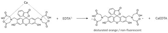 The calcein indicator has four carboxyl groups that coordinate calcium ions (Scheme 1). Since the carboxyl groups are weakly dissociated, it is assumed that only two of the four groups bind the Ca ion. The complex has a light green color and, under appropriate conditions, fluoresces. Figure 1b shows the fluorescence of calcein under LED light. During titration, calcium combines with EDTA to form a more stable complex and the free indicator is released (Scheme 2). So, the color of the solution changes to that characteristic of free calcein (desaturated dark orange). Free calcein does not fluoresce.