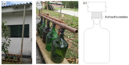 The experimental arrangement consisted of a PVC gutter connected to a downspout, which had a flexible grate installed to prevent system blockage. The downspout was connected to vertical piping, with the lower end attached to a funnel. The funnel was supported by a PVC pipe—tilted at 5°, as recommended by Yaziz et al. [31]—which directed the runoff to containers and facilitated their sequential filling. Five glass bottles (with 4.70 L of capacity) were used as collectors. Each bottle had an expanded polystyrene ball inserted to block the entry of water after the bottle was completely filled. Butyl rubber fragments were used to ensure sealing at the bottle connections. The pipes used in the arrangement met the sizing requirements described in the Brazilian standard for rainwater systems [46].