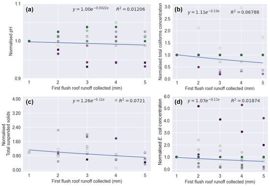 The behaviour of first flush quality parameters was assessed using normalised data (based on concentrations obtained in the first millimetre). Figure 3 shows scatter plots for the parameters pH, total suspended solids, total coliforms, and E. coli, as well as their corresponding coefficients of determination, regression equations, and fitted curves for the exponential model (points with the same colour represent data from the same sampled event). It is essential to note that different types of curves were tested, and those with the best R2 are presented in the figures. However, the method does not aim to predict dependent variable values from independent variables. This correlation was conducted solely to observe trends and discuss possible conclusions and practical perspectives.