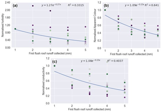 Dependence on the turbidity (a), apparent colour (b), and conductivity (c) as a function of the first flush roof runoff collected (each colour represents a rainfall event).