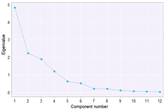 Afterwards, the factors were defined, with each factor corresponding to a grouping of variables. Since twelve variables were included in the analysis, the maximum number of factors to be obtained is twelve. The determination of each factor depends on calculating its scores, which were determined after obtaining the eigenvalues and eigenvectors of the Pearson correlation matrix.