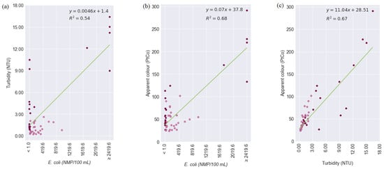 Regression analyses established linear relationships between the turbidity and E. coli, apparent colour and E. coli, and turbidity and apparent colour. Investigating the behaviour of E. coli concentration in relation to the antecedent dry weather period is essential. Based on the data collected, it is not possible to affirm that diverting a specific portion of runoff will guarantee that the rainwater collected will meet the quality recommendations established in NBR 15527 [24], especially for E. coli concentration. However, diverting the initial portion of runoff tends to reduce the contaminant load, particularly those that change the rainwater colour, turbidity, and conductivity.