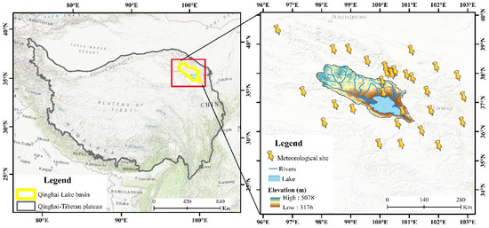 The Qinghai Lake Basin (36°32′–37°15′ N, 99°36′–100°47′ E) [34], located in the northeastern Qinghai-Tibet Plateau (Figure 1), exhibits a pronounced west-to-east topographic gradient, and is characterized as an alpine semi-arid ecosystem [35]. The basin experiences distinct wet and dry seasons, receiving most of its annual precipitation (approximately 80%) between May and September [36]. Annual precipitation averages around 400 mm, with air temperatures ranging from −1.1 °C to 4.0 °C [37], characteristic of a typical plateau continental climate. Vegetation within the watershed primarily comprises alpine meadows, alpine shrubs, and wetland meadows [38], mainly distributed north of Qinghai Lake. Permafrost is extensively distributed across the basin, covering approximately 42% of the total area [37]. Due to the limited number of 0.1° × 0.1° grids in the basin, model training was prone to underfitting. In addition, the availability of ground meteorological observations was restricted to only three stations, insufficient for robust evaluation of gridded datasets. Therefore, the study domain was expanded (as shown in the boxed area in Figure 1) to enhance model training effectiveness and ensure adequate data support. This extension serves two main purposes: first, to increase the number of training samples by encompassing more coarse-resolution satellite grid cells, thereby improving the model’s learning capability; second, to incorporate additional publicly available rain gauge data from the expanded region to strengthen the validation of the downscaled precipitation products. These supplementary data substantially improve the spatial coverage and provide more representative ground truth information for model evaluation. Although the total number of rain gauge stations remains relatively small, the combined use of multiple data sources ensures a scientifically rigorous approach and enhances the reliability of the downscaling results under limited data conditions.