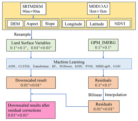 The core principle of statistical downscaling lies in modeling the relationship between precipitation and surface predictor variables (e.g., NDVI, DEM) at a coarse spatial resolution (0.1° × 0.1°), and extrapolating this relationship to finer resolutions (0.01° × 0.01°) [13]. In this study, NDVI, DEM, slope, and aspect were selected as surface descriptors [46], while longitude and latitude were incorporated as additional spatial predictors [47]. Machine-learning regression models were employed to capture the nonlinear mapping between precipitation and surface characteristics. High-resolution downscaling was achieved by applying the trained models to the 0.01° surface feature grids. To further improve accuracy, a residual correction step was introduced to account for precipitation variability not captured by the models [31]. First, precipitation estimates at 0.1° resolution were obtained from the downscaling models. Residuals were computed by subtracting the original GPM 0.1° precipitation values from the predicted 0.1° outputs. These residuals were then interpolated from 0.1° to 0.01° resolution using bilinear interpolation. Finally, the interpolated residuals were added to the 0.01° downscaled precipitation outputs to obtain the corrected high-resolution precipitation fields. The complete downscaling and residual correction workflow is illustrated in Figure 2.