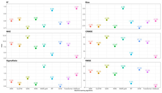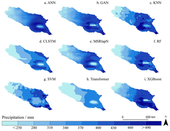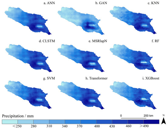To conduct a preliminary assessment of model performance, nine machine-learning algorithms were applied to reconstruct precipitation data at a spatial resolution of 0.1° for the period 2001–2020, without implementing any spatial downscaling. This procedure served to evaluate the intrinsic reconstruction capabilities of each algorithm and to screen suitable candidates for subsequent downscaling tasks. The performance evaluation metrics for each algorithm are shown in Figure 3, while the predicted spatial precipitation distributions for the year 2005 are illustrated in Figure 4.