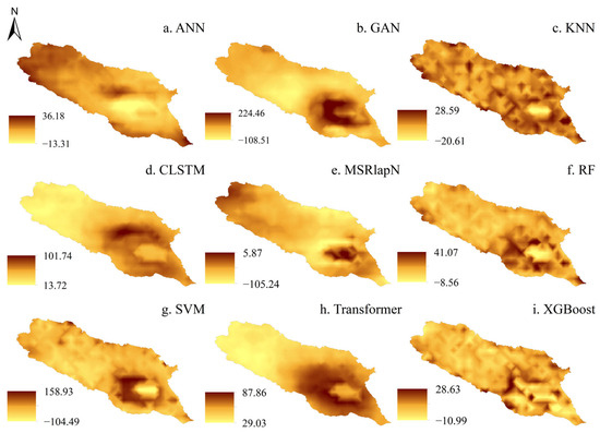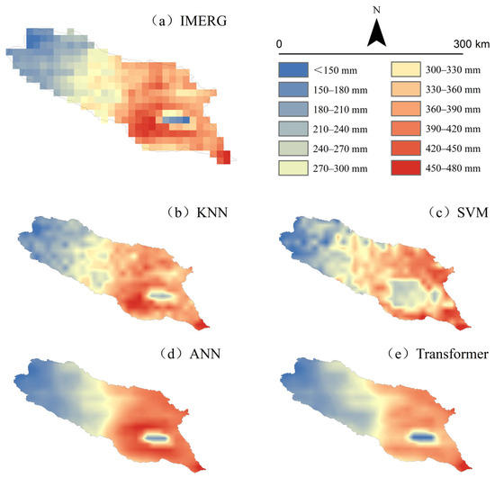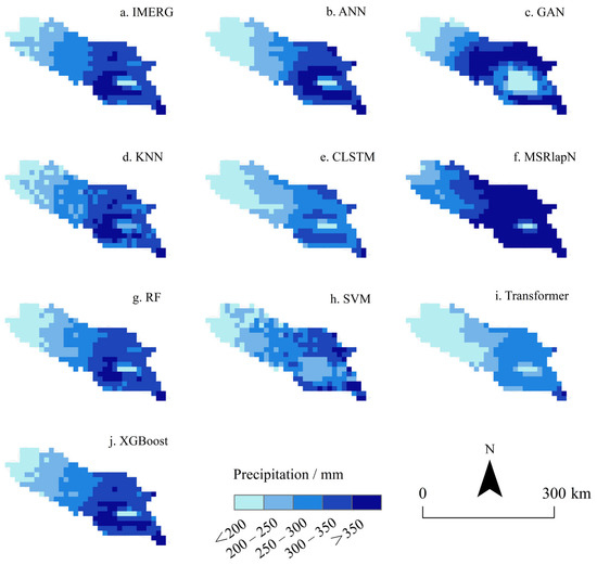 Although the GAN model produced the lowest bias (−0.05 mm), it exhibited substantial variability in its predictions (MAE = 11.47 mm, RMSE = 19.49 mm), with spatial outputs showing alternating regions of high and low values. Transformer, generated an overly smoothed spatial trend, failing to effectively capture variations in high-value regions—a trend that can be attributed to its significant underestimation, as evidenced by the largest bias (−3.62 mm). The ANN, SVM, KNN, and CLSTM consistently underestimated precipitation, with biases ranging from −2.9 mm to −3.62 mm and RMSEs between 13.86 mm and 15.94 mm. MSRLapN was the only model to overestimate precipitation (bias = 4.90 mm), showing a marked deviation from observed values (RMSE = 18.96 mm) and a spatial pattern indicative of high-value region diffusion.