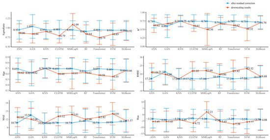 Figure 7. Comparison of evaluation metrics before and after residual correction for nine ML-based downscaling methods.