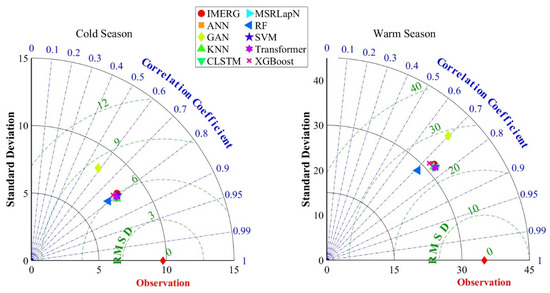 Figure 8. Taylor Diagram for the Calibration of Precipitation Datasets in the Cold and Warm Seasons Based on Ground-Based Observations.