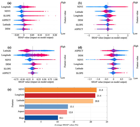 Figure 14. SHAP analysis results for selected models: (a) ANN, (b) KNN, (c) SVM, (d) Transformer, and (e) average feature importance across models.